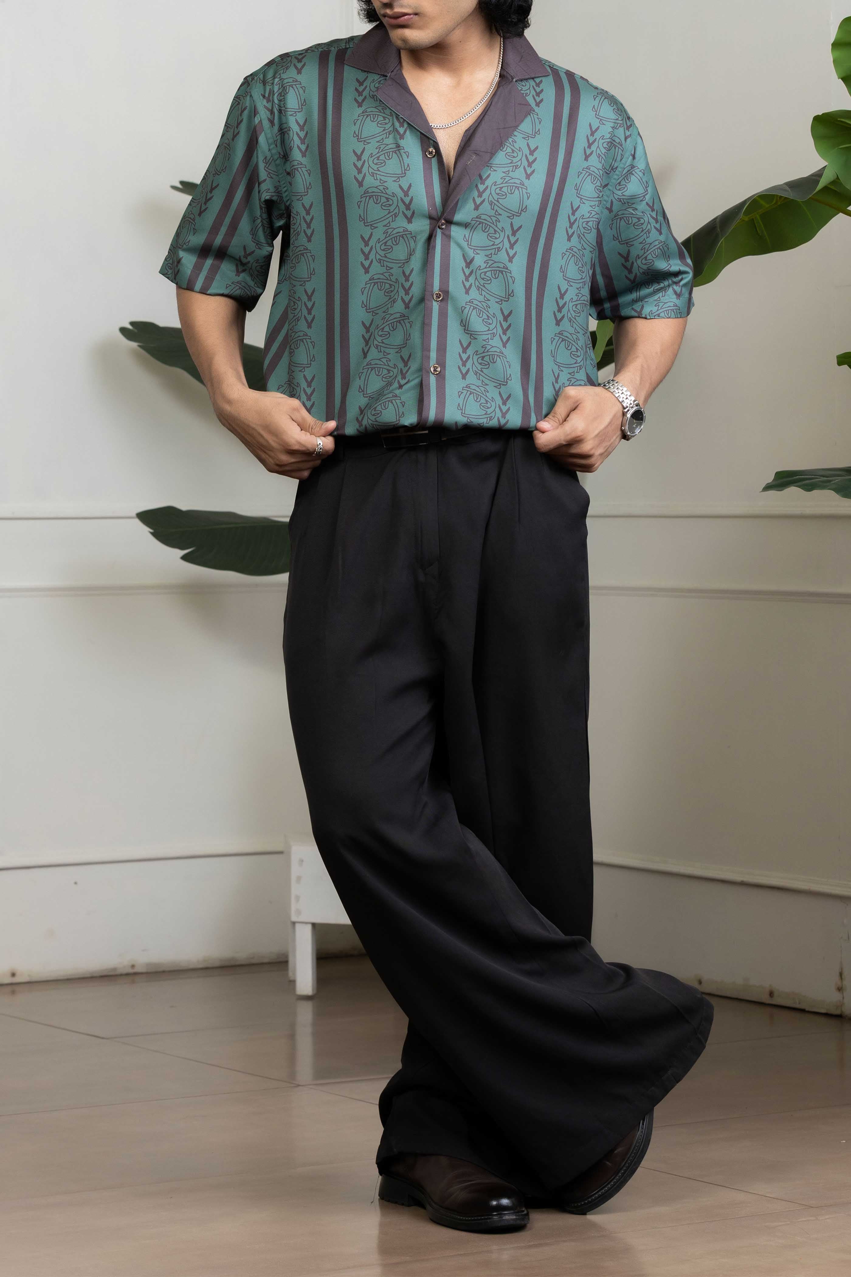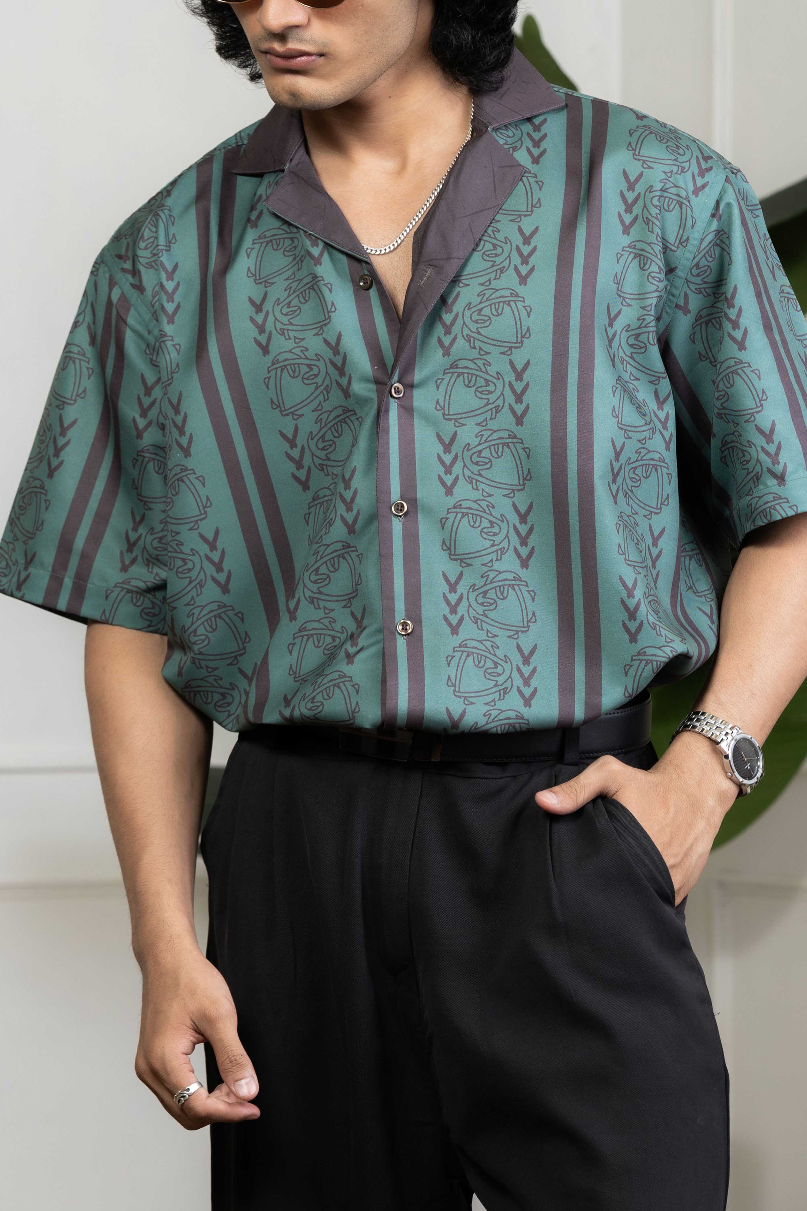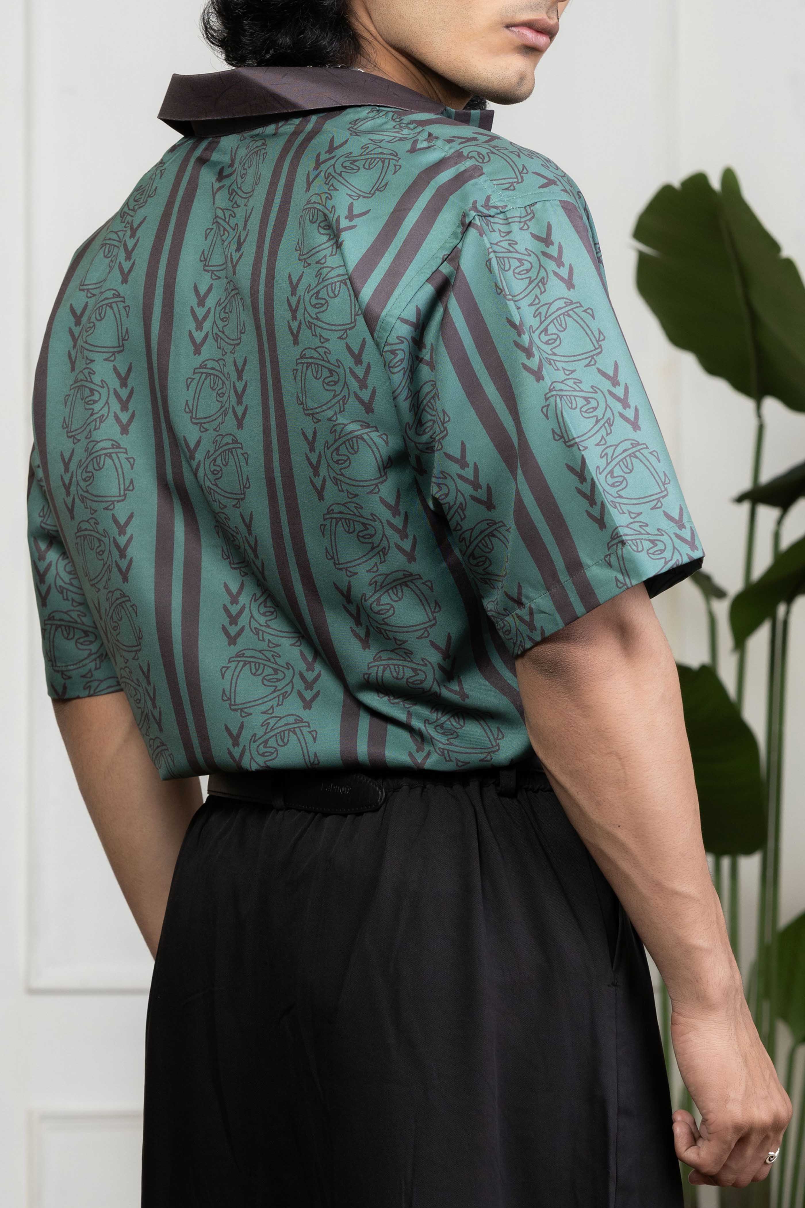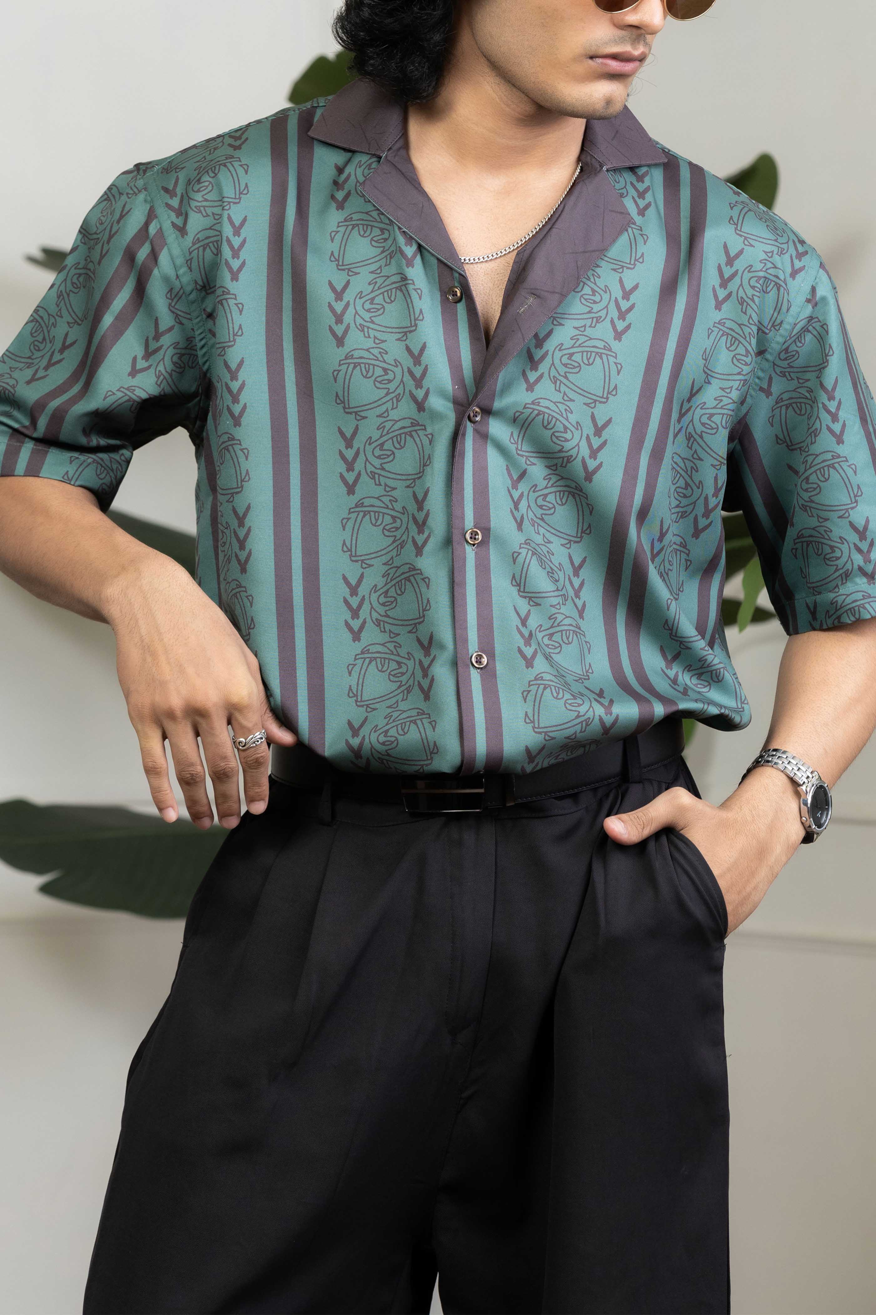 Made from ultra-soft viscose, the “Celestial Descent” shirt is where structure meets flow. Hand-drawn motifs shower down in divine rhythm, framed by precise, symmetrical borders — a harmony between abstraction and geometry. The fabric breathes with ease, light against the skin, offering all-day comfort while carrying a quiet, magnetic presence. Stunning yet understated — this shirt isn’t loud, but it speaks volumes.