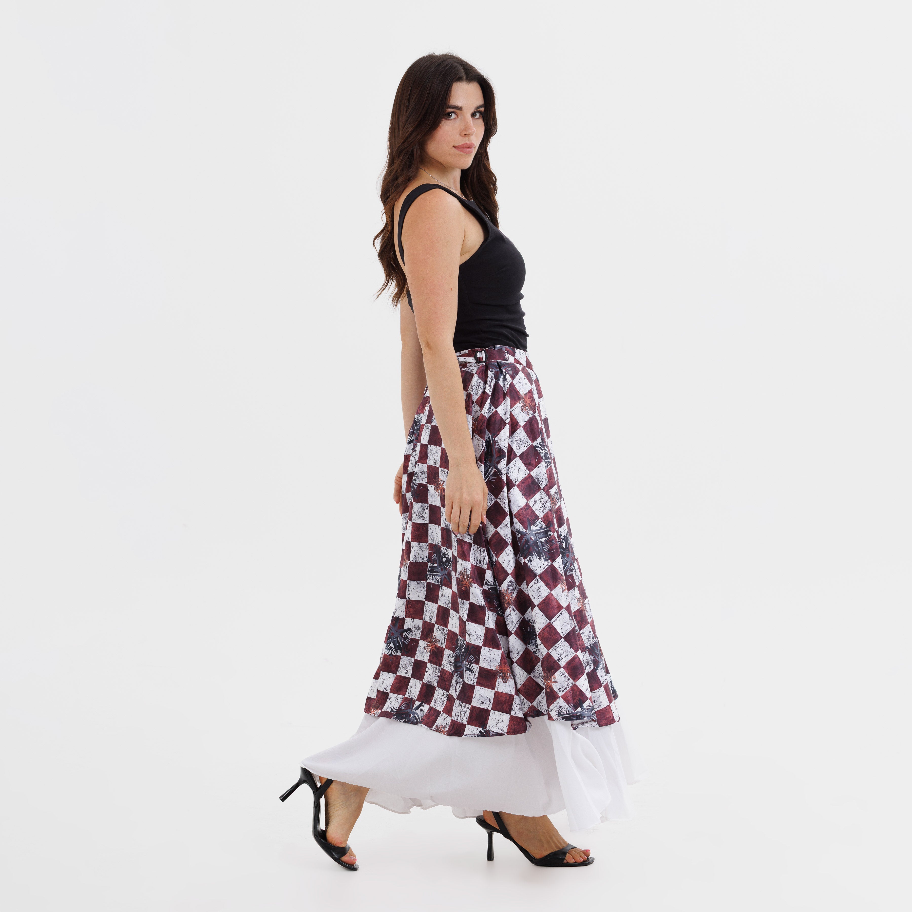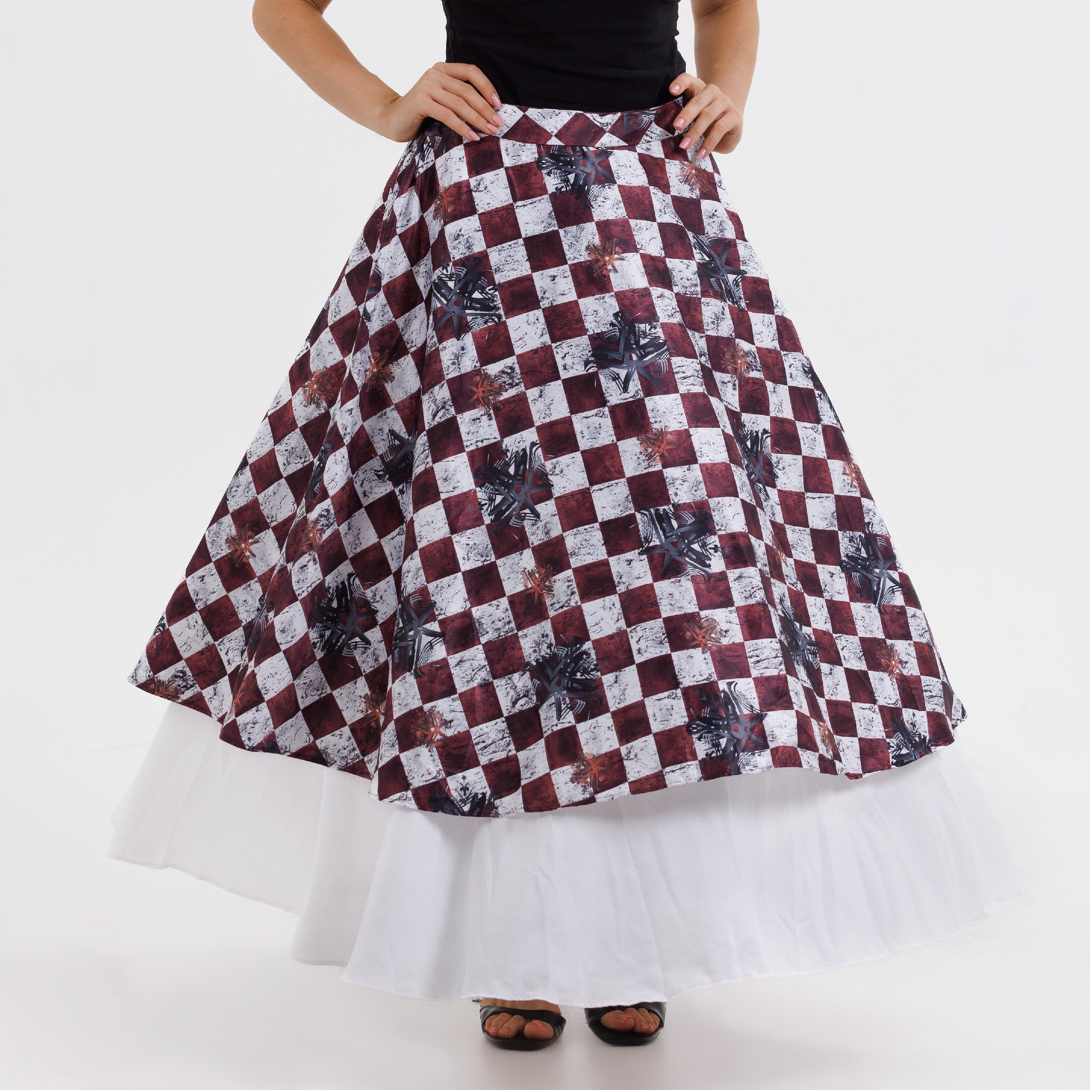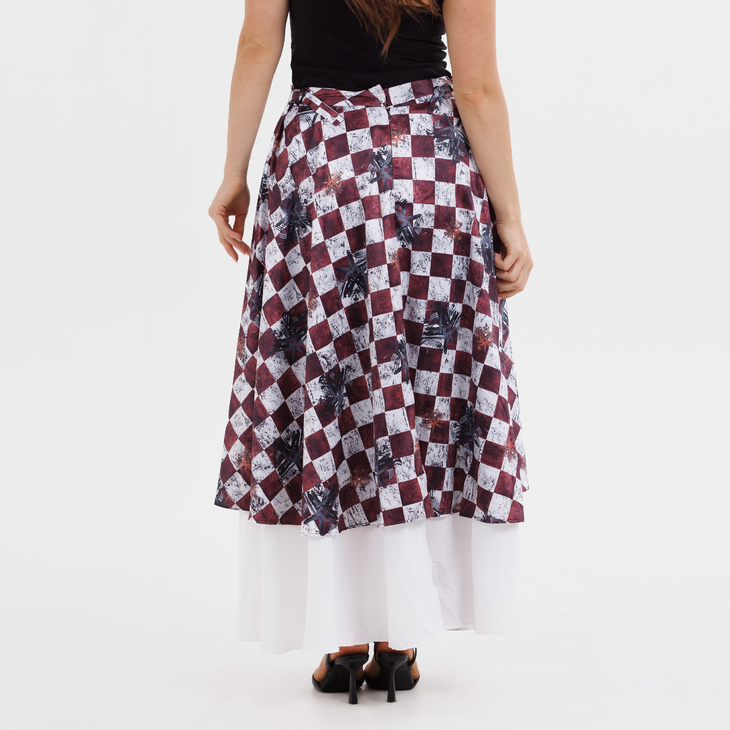 Astral Dynasty Tiered Skirt in Luminara elegance made radiant. The Astral Dynasty tiered skirt is crafted in two flowing layers, its wide body designed for effortless movement. A white satin inner brings subtle glow and vibrance, while the outer surface carries the Astral Dynasty artwork in full expanse.