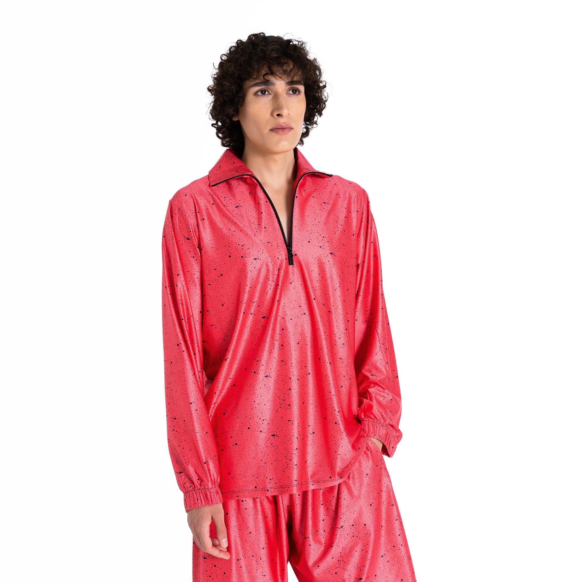 The “Dots” t-shirt is the perfect addition to the sports clothes collection for women. Its vibrant color and eye-catching splashed texture make it a standout piece, while the high-performance fabric ensures you stay comfortable and dry during your workout. The zipper closure collar and elasticated sleeves enable a versatile, customizable fit that’s perfect for layering or individual styling. “Dots” is the ideal gym top for men who want to look and feel their best during a workout.