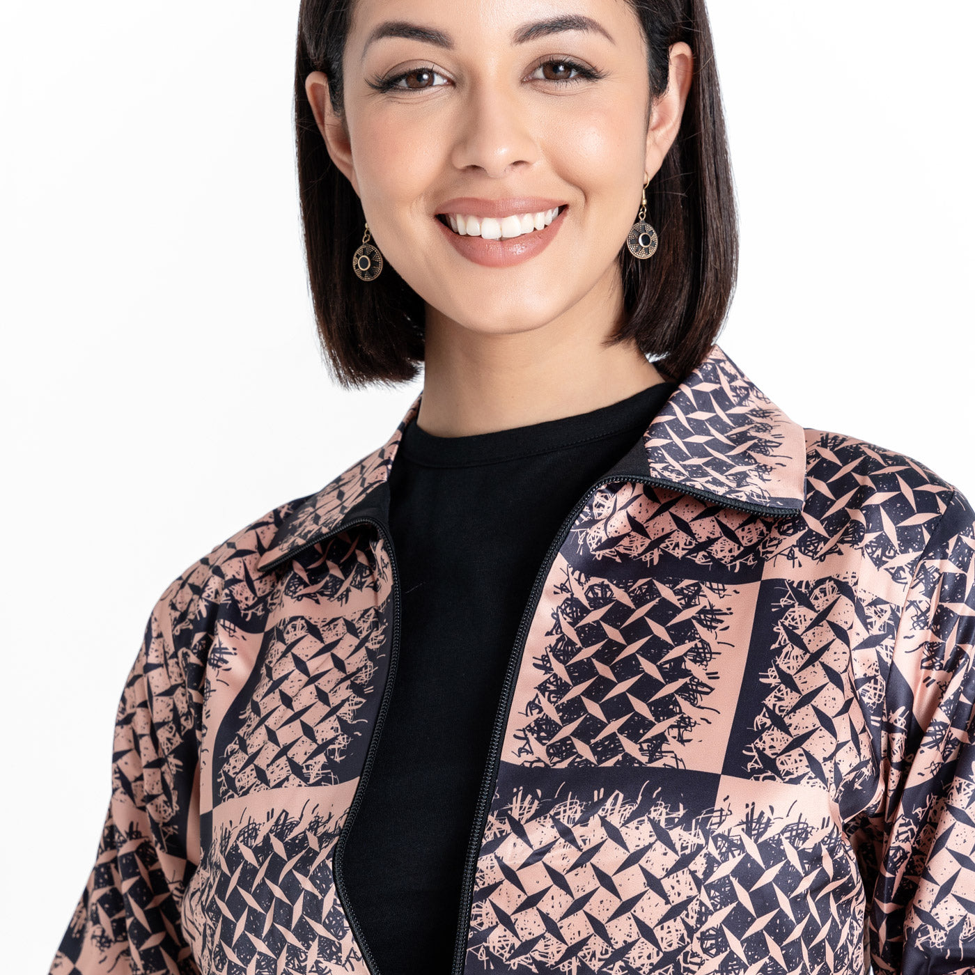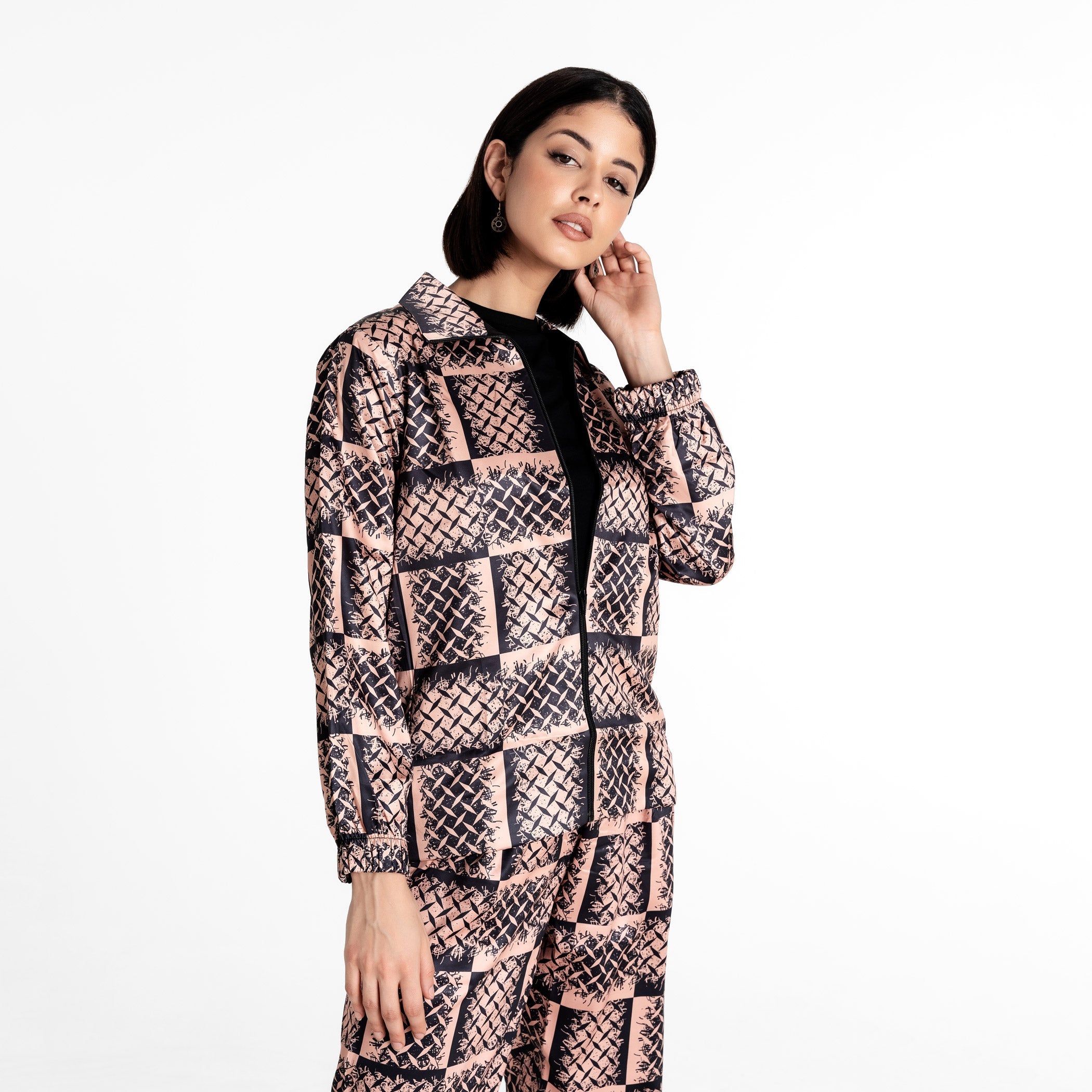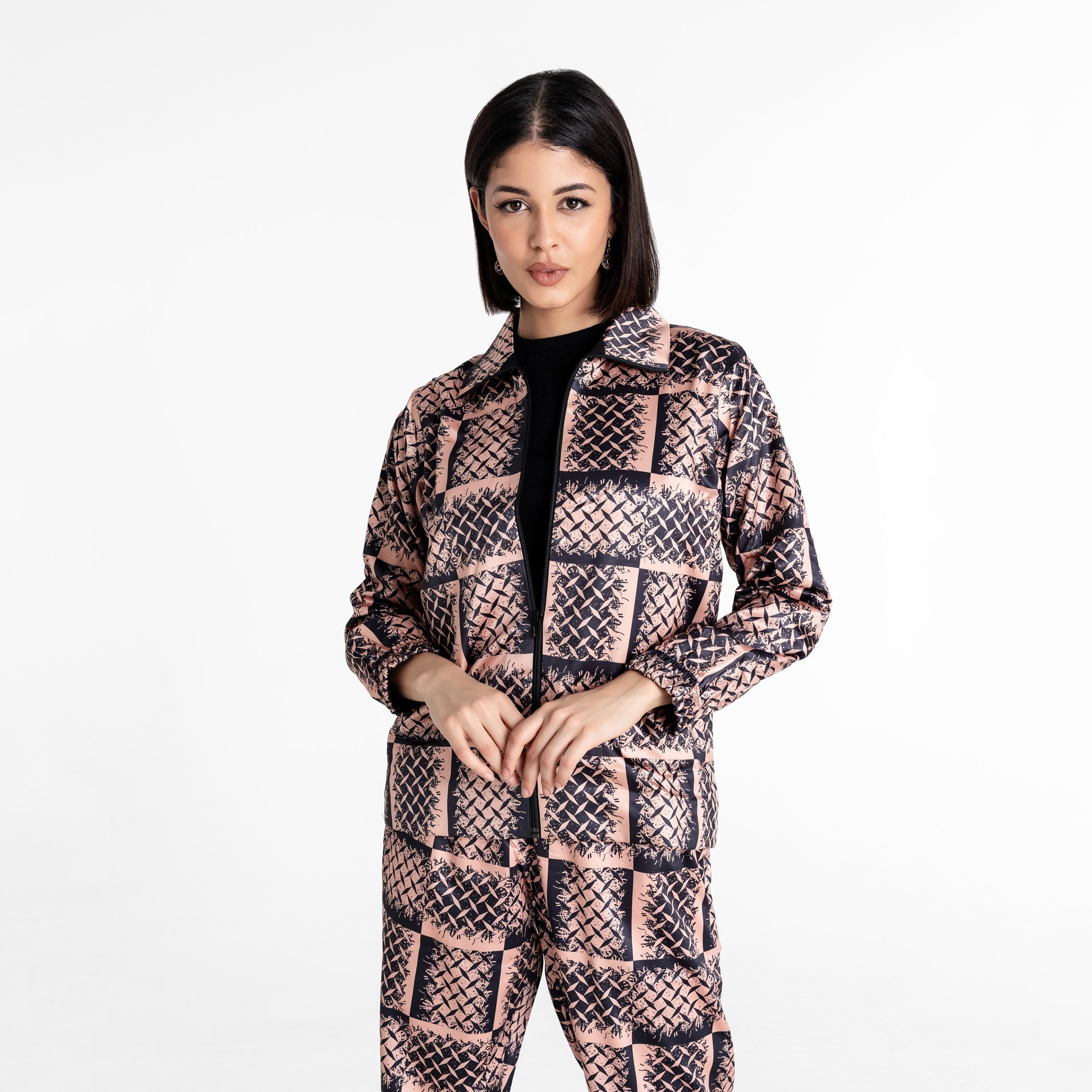 "The First Strand" streetwear jacket captures the perfect balance of symmetry and abstraction with a high-energy print designed to inspire you to push your limits. Crafted from luxurious printed fabric, it features a full zipper for functional style. The smart collar and elasticated sleeves provide a structured yet comfortable fit. Perfect for travel and layering, it works well in all seasons as a standalone piece or a winter streetwear jacket. Wear it to make a strong style statement.